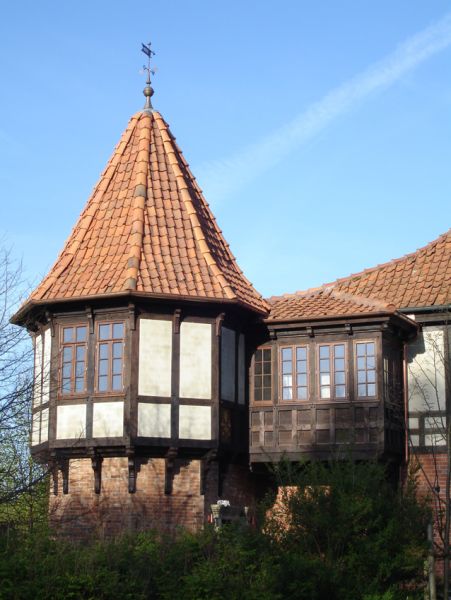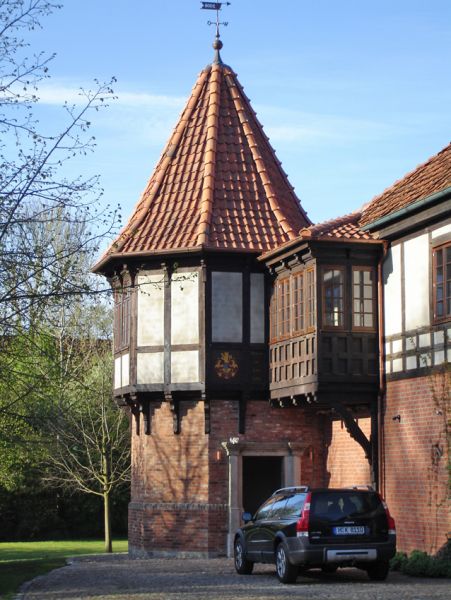 An den stilvoll gestalteten Neubau von 2000 setzten wir 2006 einen 11,80 m hohen achteckigen Turm an, der im Durchmesser 5,70 m misst. Dunkel lasierte Eichenholzstämme erwecken den Eindruck, schon Hunderte von Jahren diesem Bau Halt zu geben. Zwei Räume haben in diesem Turm Platz, einer oben und einer unten. Die Tür führt in die „Gesinderäume“ – in die Küche.