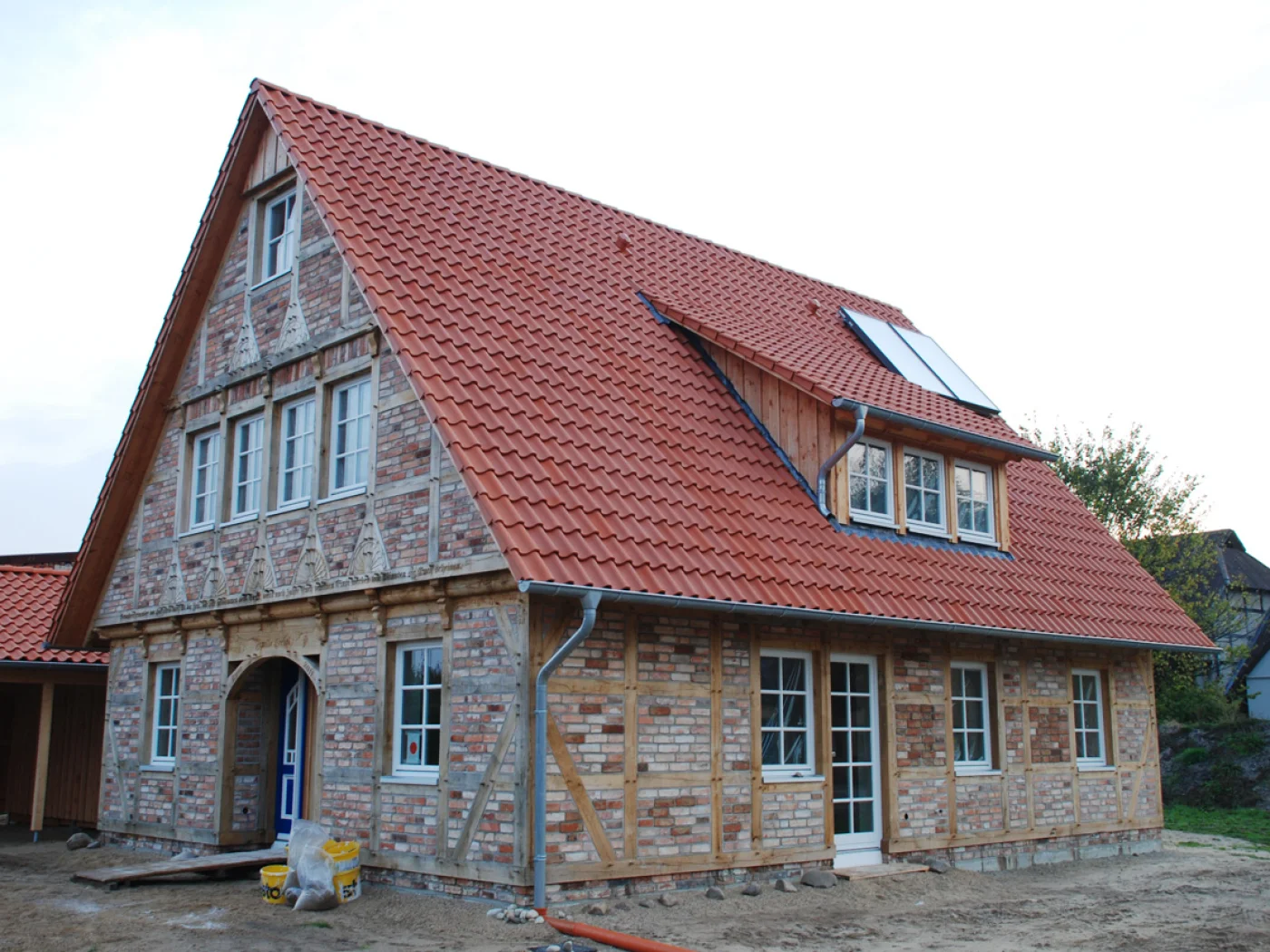 Dieses wunderschöne Fachwerhaus wurde in Sassenburg errichtet und verfügt über 152 qm Wohnfläche. Die blau lackierte Eingangstür wird durch die Anordnung an dem auskragenden Giebel besonders hervorgehoben. Auf dem Dach wurde eine Anlage für Solarthermie installiert.