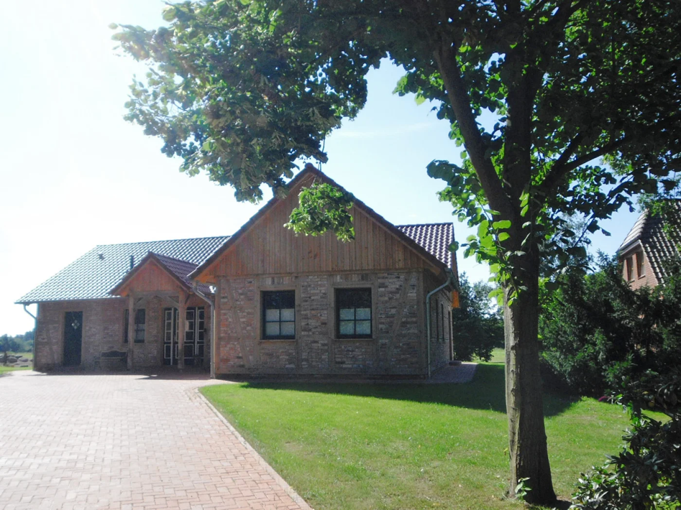 Der erste Fuhrberger Fachwerk-Bungalow, fertiggestellt im Dezember 2011. Ungefähr 150 qm Wohnfläche bieten viel Raum auf einer Ebene. Durch den Entwurf mit drei Giebeln entstehen viele windgeschützte Ecken am Haus. Einladend: Die Überdachung der Haustür. Bodentiefe Fenster zur Gartenseite lassen viel Sonne herein. Gestalterisch besonders gut gelungen ist hier die Idee der Bauherren, ein komplettes Dach zu bauen, das aber nur zur Hälfte Wohnraum bedeckt. So entsteht eine überdachte Terrasse.