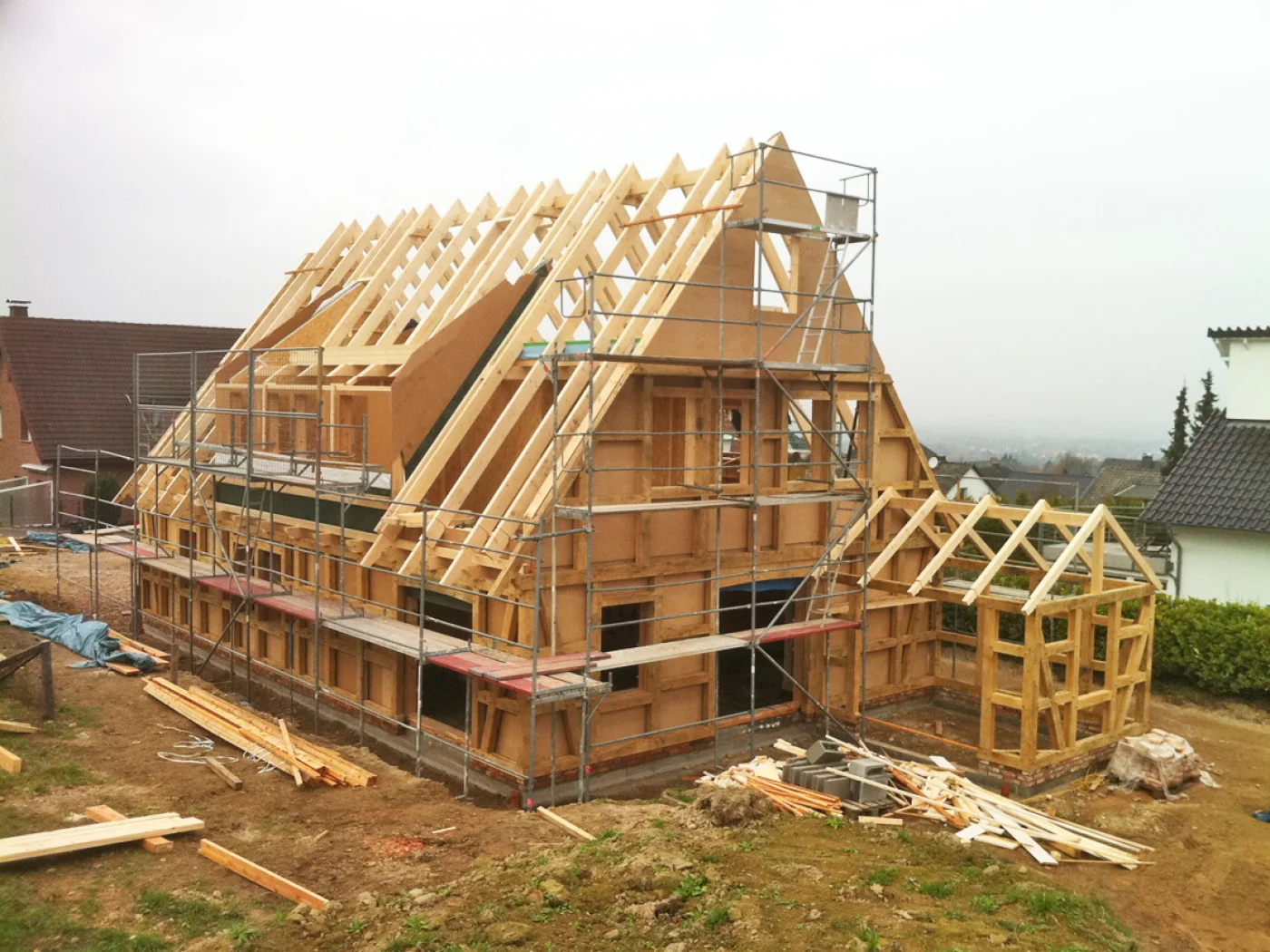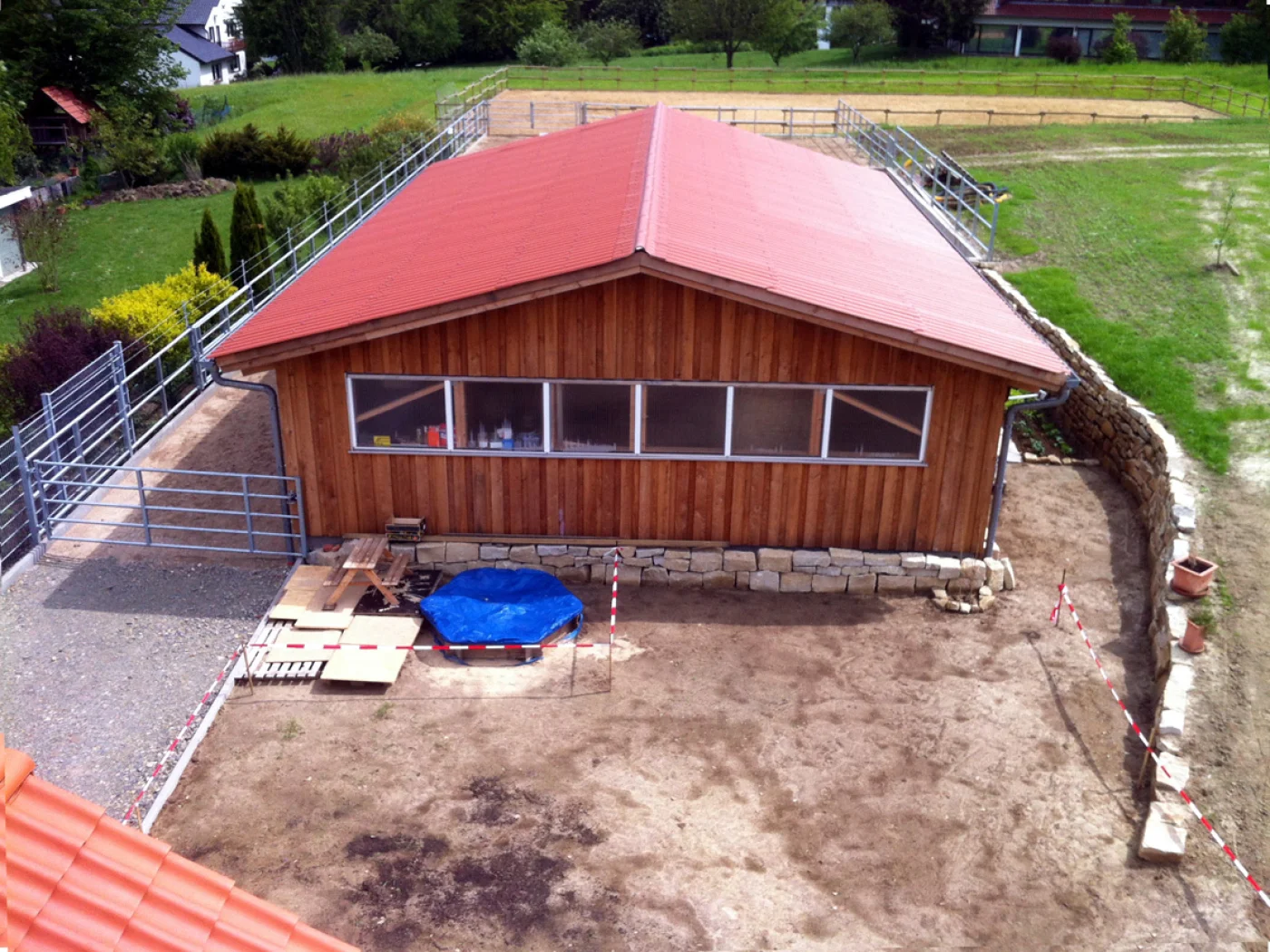Angebauter Geräteschuppen, der sich in der Flucht des Haupthauses fortsetzt und somit eine stimmige Gestaltung gewährleistet. Da die Gebäudeöffnung nicht durch schwere Türen verschlossen wird, kann dieser Geräteschuppen auch als Freisitz genutzt werden.